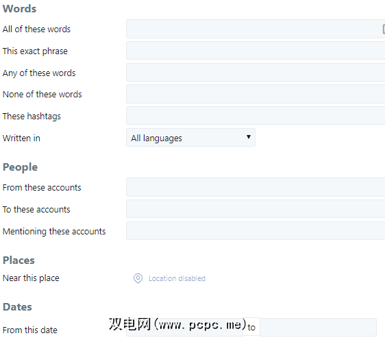 就像Google的工具一样,您可以使用关键字,词组,排除的单词和语言来缩小搜索范围。该功能还具有一些特定于Twitter的字段。您可以按标签,日期和地点以及用户(发送,发送和提及的用户)进行搜索。