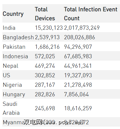 此外,Agent Smith感染了设备数量。迄今为止,印度感染人数最多。 Check Point的研究表明,约有1500万台设备搭载了Agent Smith。接下来的国家是孟加拉国,大约感染了250万台设备。在美国有300,000多个Agent Smith感染,在英国大约有137,000感染。