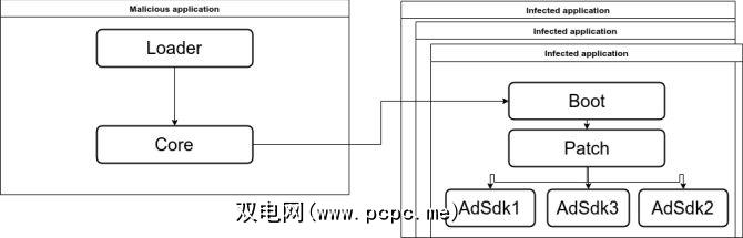 下一次受感染的应用程序启动时,Boot模块将运行Patch模块,该模块使用AdSDK模块执行以下操作:引入广告并开始产生收入。