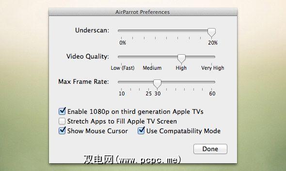 这听起来很复杂,但后果却很简单–视频转码延迟和帧速率都不可靠。在大多数情况下,这并不麻烦。 AirParrot首选项使您可以更严格地控制视频质量和帧速率。如果您想在网上冲浪或显示图片幻灯片,AirParrot就是很棒的选择。但是,您将无法舒适地将长视频流式传输到Apple TV。