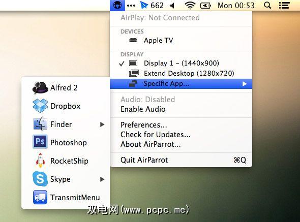 AirParrot的第三个显示选项更加有趣,尽管该功能仅可用使用AirParrot的Mac OS X客户端。您可以要求AirParrot通过Apple TV仅显示一个特定的应用程序,而不必镜像或扩展计算机的显示。再次使用AirParrot的下拉菜单,只需选择一个当前打开的窗口化应用程序,即可将其流式传输到您的Apple TV。
