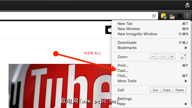 在Google Chrome浏览器中,点击设置菜单会显示一个投射选项。这会将您当前使用的选项卡发送到AirServer。您的AirServer基本上像Chromecast一样运行!