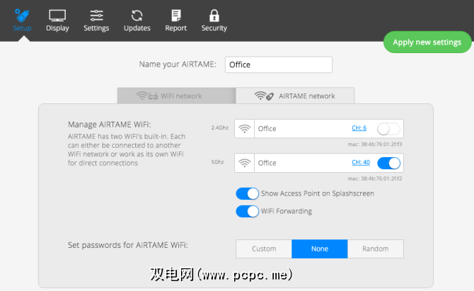 Airtame提供的大量配置选项让我感到惊喜。您可以在2.4Ghz或5Ghz频道上设置Ad-hoc Wi-Fi网络,甚至可以手动指定频道。至关重要的是,Airtame支持 WPA2 Enterprise 安全,这是Chromecast明显缺乏的安全性。