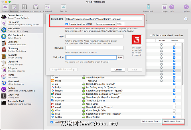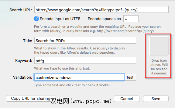 输入标题来设置关键字的显示文字;这将显示在Alfred的结果页面中。还要设置您要用于自定义搜索的关键字。现在,输入任何文字,然后点击测试按钮,以检查您是否具有正确的自定义搜索网址。