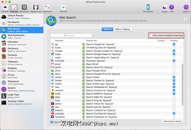 这些关键字是完全可定制的。双击一个关键字,然后输入一个新的关键字来替换它。虽然无法删除默认搜索,但是您可以将其禁用。只需取消选中 Enabled 框。