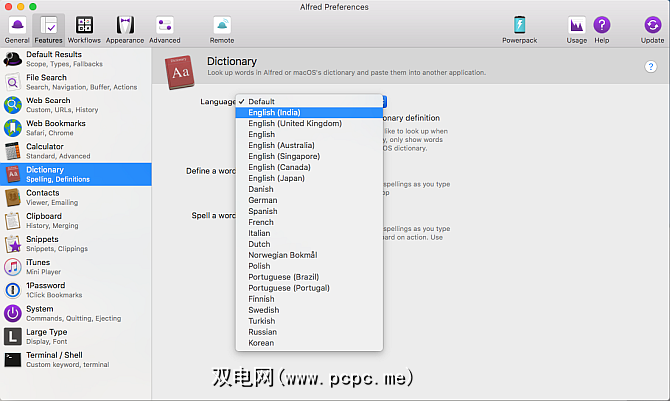 要更改Alfred词典,请转到首选项>功能并点击词典。在右窗格中,从语言部分中选择一种新语言。