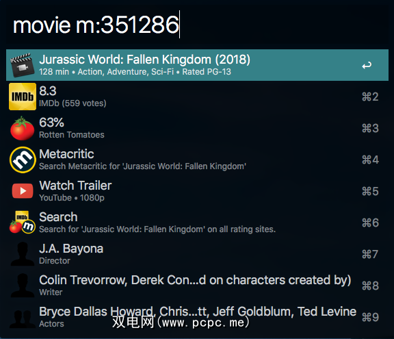 要使用此工作流程,请键入电影,然后键入电影标题。按 Enter 获取有关该电影的信息。同样,输入 TV ,然后输入电视节目标题。