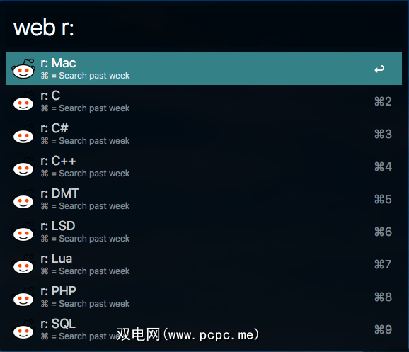 此工作流程的名称真实。键入 web ,后跟一个前缀以表示搜索范围,类似于DuckDuckGo的Bangs。