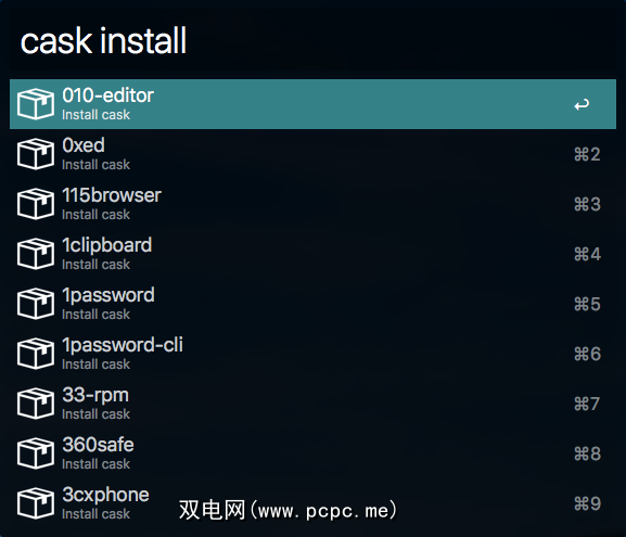 键入酿造或酒桶,然后选择要调用的命令。您可以直接从Alfred查看并安装软件包。