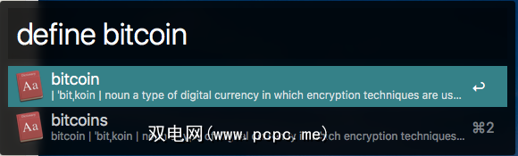 Alfred提供对默认macOS词典的访问权限,以帮助您快速拼写单词或定义单词的含义。使用关键字 define 或 spell ,后接一个单词试试看。键入时,Alfred将开始猜测该单词。按 Enter 在 Dictionary 应用中打开单词。