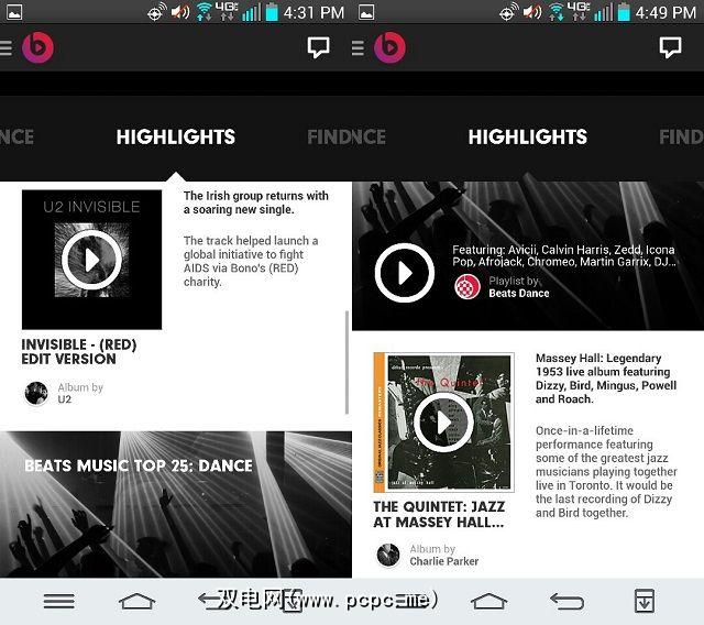 这是应用程序的核心推荐页面,它依赖于大型的人工编码人类直觉数据库,其中包含相似的歌曲(相比之下,Spotify和Pandora使用音乐的算法分析来生成其歌曲排序)。从结构上讲,该页面类似于Spotify的“发现"页面,显示了该网站认为您可能喜欢的专辑和歌曲的长长列表。这些建议似乎并没有比Spotify明显好,但是随着该应用程序收集了更多信息,它可能会有所改善。 “ Beats by Dre",其中包含音乐行业巨头的最新专辑和播放列表。这很酷–但是,就象耳机一样,根据自己的优点来销售产品并没有多大作用。