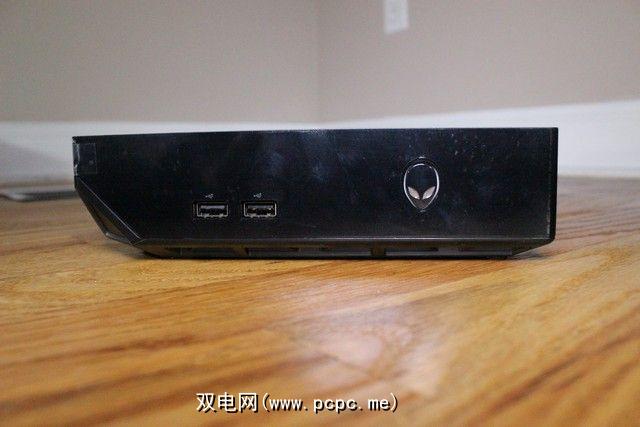 Alienware Alpha当然是外观。底角带有少量强调光;发光的Alienware徽标位于前面板上,还可以用作电源开关。电脑的其余部分为亮黑色,前面唯一的其他是两个USB端口。