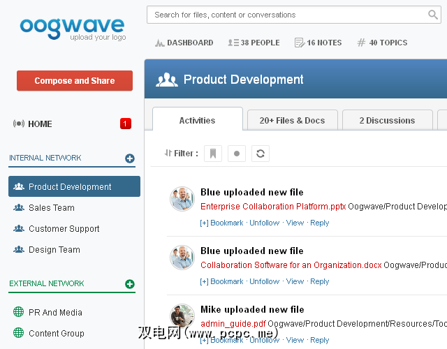 Oogwave提供了三种在线计划:最多20名成员的免费基本服务,每月49美元的业务费用以及拥有100多个成员的企业,每位用户$ 3。 Oogwave帐户包含一个仪表板,员工或小组成员可以在其中通过所谓的内部网络工作区进行交流和协作。还可以建立外部网络以与编外人员进行协作。