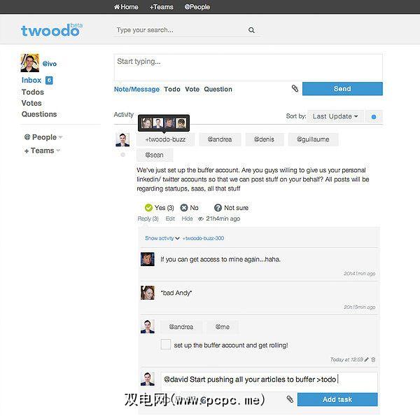 Twoodo更像是一个简单的留言板,可以代替内部电子邮件。与iPhone待办事项列表应用程序Wunderlist相似,Twoodo可用于共享笔记,待办事项列表,共享任务或正在进行的有关各种主题的聊天。通常,这是在所谓的“命令框"中完成的,用户可以在其中使用类似Twitter的标记从一个地方创建和管理任务,消息,日历事件和便笺。您基本上可以在一个句子中发送消息,更新任务列表,设置重要性级别并标记消息。