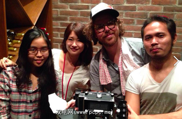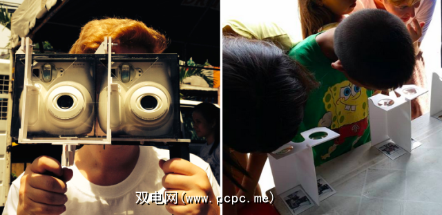最后,我个人有幸在其中使用了这款相机菲律宾是自制的立体即时相机(下)。 “它实际上是一个容纳两台Fujifilm Cheki小型相机并同时拍摄两张即时照片的房屋"。要以3D方式查看照片,需要将几个廉价的放大镜绑在临时折纸样式的镜架中,以为两张照片创建查看器。 “看着人们看到自己从3D照片中弹出来的反应真是有趣。