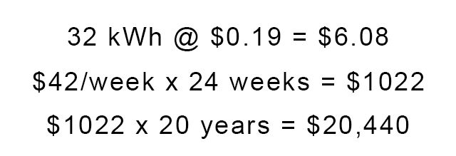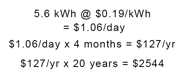 那能为您省多少钱?如果一个加热器可以在整个白天保持客厅温暖,那就意味着不打开加热器需要6到10个小时。我们一般的客厅通常需要3200瓦的电加热器。如果运行10个小时,则为32千瓦时(kWh)。假设您的电费为19美分/千瓦时。每天超过$ 6或每周$ 42。从十月到三月,大约是$ 1022。假设电价再保持20年不变,则20年的节省为20,400美元。是的,没错。