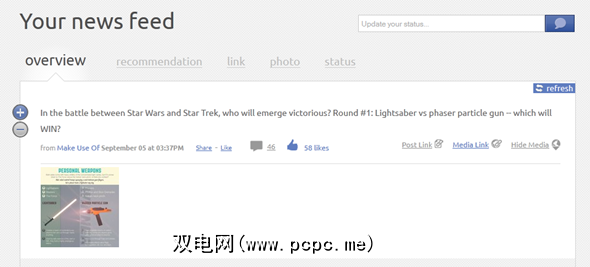 如您所见,LeFeed的界面是与Facebook完全不同。首先,它的范围要广得多,没有广告,工具栏,聊天栏,新闻自动收录器和其他干扰因素。您也可以选择隐藏或显示您浏览的帖子的媒体,以使实际内容更清晰。以下是您可以通过LeFeed界面执行的操作的完整列表: