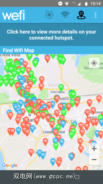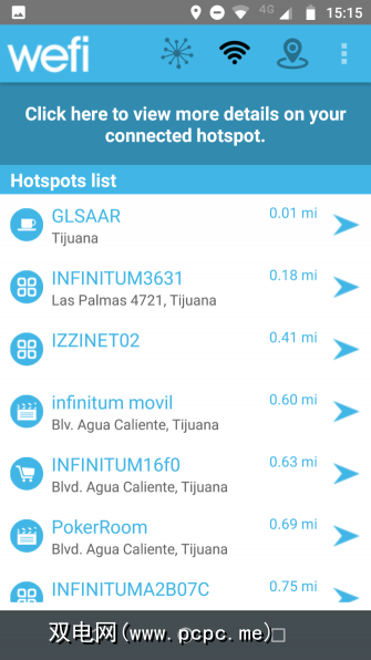 Wefi是另一个适用于Android和iPhone的免费Wi-Fi查找器。它提供了对全球数百万个热点的访问。正如您所期望的那样,所有要点均清晰地显示在地图上,并且易于定位。