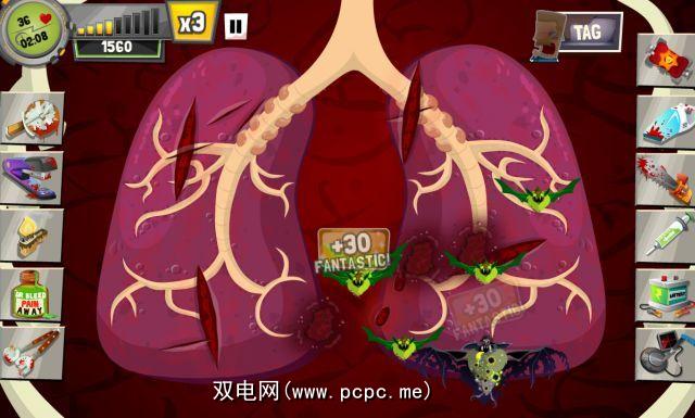 业余外科医生3引入了一个新元素:标记团队合作伙伴。在玩游戏时,您将解锁(或购买)新的伙伴,例如舔它的狗可以治愈病人的狗,或者将重击并杀死任何敌人的中士(例如吸血鬼中的蝙蝠)。您需要在每次任务前选择一个标签团队合作伙伴,并在他们的酒吧被收取费用时激活他们。 ,“业余外科医生3"会限制您一次尝试的次数,并在一定时间后重新尝试。因此,如果您连续连续输掉3次,则需要再等待30分钟才能再次玩。虽然这听起来很烦人,但以我的经验来看,这没什么大不了的。每个关卡持续至少3分钟(有时甚至更长),因此至少要花10分钟才能耗尽游戏。另外,游戏并不难,您可以连续输掉三遍。对我来说,在完成游戏的过程中,我只有3次没钱了,在这种情况下,我稍作休息就可以了。