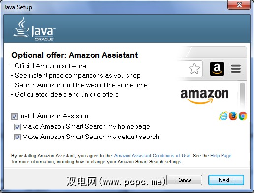 避免亚马逊的另一个重要原因助手:狡猾的策略以增加其曝光率和采用率。早在2016年,Oracle(当前的Java开发人员)就开始将Amazon Assistant捆绑为Java 8安装程序的一部分,该安装程序不仅安装了Amazon Assistant,而且还将浏览器主页和搜索引擎更改为Amazon Smart Search。