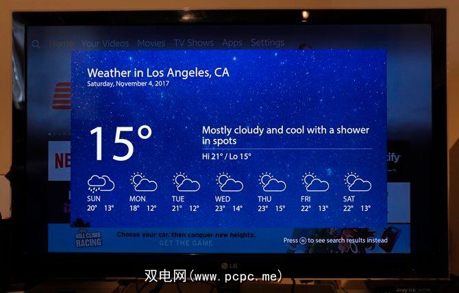将Alexa连接到电视的独特优势之一就是您现在可以直观地看到Alexa的结果。这使得检查天气,在亚马逊上购物甚至买食物等事情变得非常直观。天气显示为一周的天气预报,而不是大声朗读。如果您不愿意在手机上打开浏览器来寻找食物,Alexa会在附近显示餐馆,并提供开放时间和联系信息。