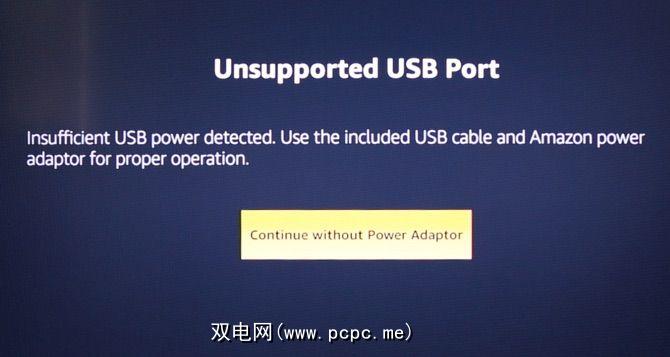 撬开亚马逊火橙盒后,您会找到“吊坠",电源砖,微型USB电缆,遥控器和2节AA电池。电视上有一个免费的USB端口,以避免为了整洁而不必使用电源砖将是有利的。但是,使用电源砖将意味着稍短的启动时间。如果您电视上的端口没有足够的电源为设备供电,也会发出警告。它仍然可以正常工作,但是无法推送4K内容。