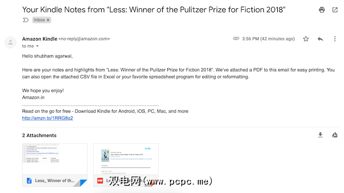 对于希望共享一本书中所有亮点和笔记的人,也可以将其导出。在同一Notes窗格中,有一个标题为导出注释的按钮。当您通过该操作请求亮点时,Amazon将向您发送一封电子邮件,其中包含PDF和CSV文件,其中包含该特定书中的所有注释。