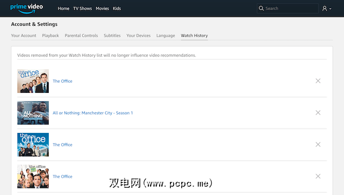 在这种情况下,您应该学习如何修改帐户的观看记录。要清除观看记录,您需要转到帐户和设置,然后单击观看记录标签。在那里,您可以通过点击视频旁边的X图标来摆脱您在Prime Video上观看过的所有节目或电影。