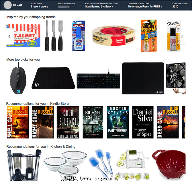 上面的屏幕快照显示了我的Amazon主页。我正在分享它,以便您可以看到Amazon推荐引擎的看法。所有这些建议和广告都是基于我在亚马逊的个人历史,该历史实际上可以追溯到2010年。