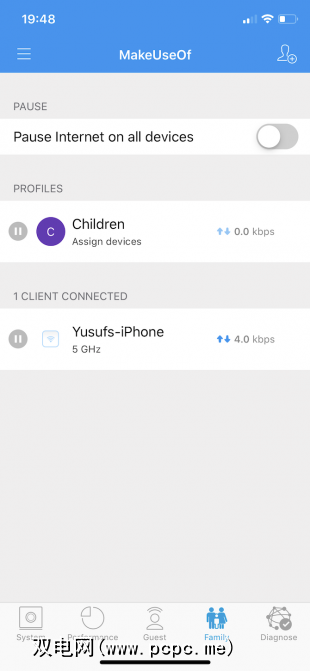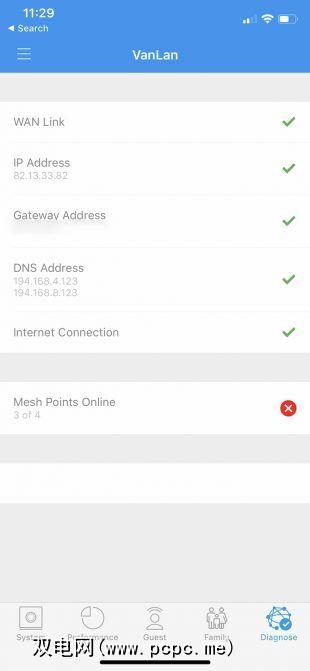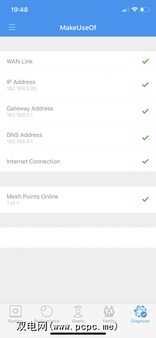 要确保您的网络运行平稳,可以在性能部分进行速度测试。该应用程序还会跟踪您以前的速度测试,以防您需要与ISP支付的速度进行竞争并检查信号质量。如果您的用户中有一个问题,“诊断"选项卡将在几秒钟内为您快速关闭网络,让您尽快解决问题。