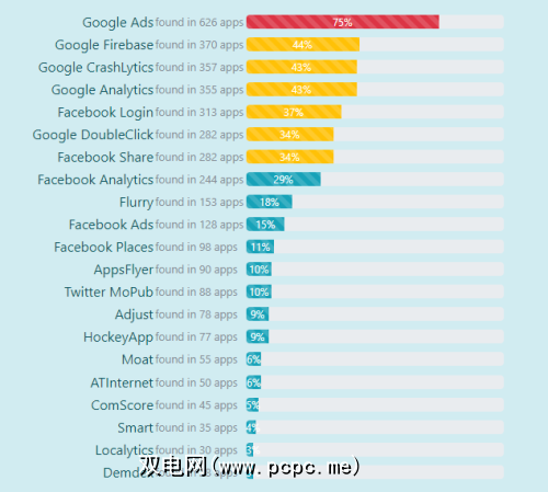 鉴于我们正在讨论Android平台,您可以猜测谁拥有最多的跟踪器。没错:Google在大量应用程序中都提供了功能。您可以在下面看到“出埃及记最频繁的跟踪者"列表。