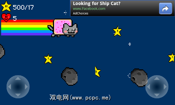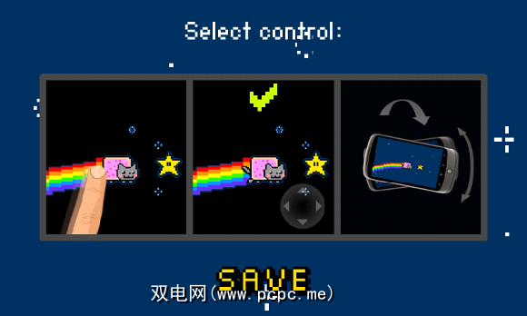 第一种可以直接拖动Nyan Cat,第二种可以提供一对d-pad,第三种可以通过倾斜设备来控制Nyan Cat。上面选择的一个最适合我,所以这就是我的建议。以下是游戏本身的屏幕截图: