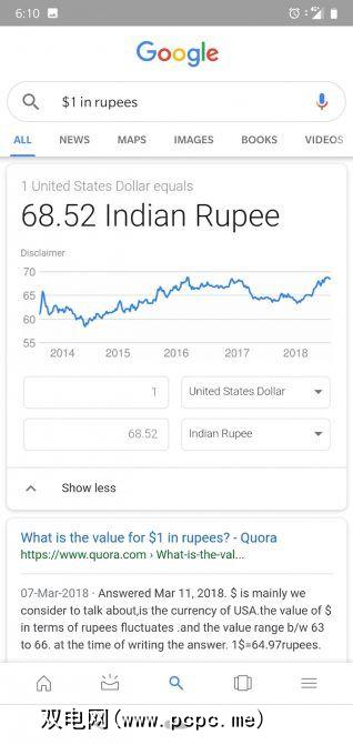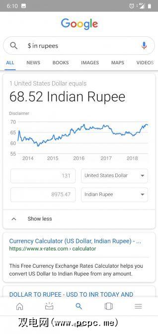 货币转换也可以在Google应用中进行。您可以通过键入诸如 $ 5 in INR 之类的确定查询进行搜索,也可以查询 $ INR ,然后填写值。 Google搜索还会显示历史汇率图表,并允许您通过下拉菜单切换货币。