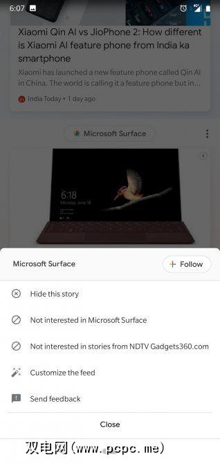 您Feed中显示的大多数文章都是根据您的偏好和搜索历史量身定制的。但是,如果您不喜欢某些内容,则可以在Feed本身上进行更改。点击卡片的三点菜单,您将在三个菜单中进行选择:隐藏特定故事,完全不关注主题或屏蔽来源网站。