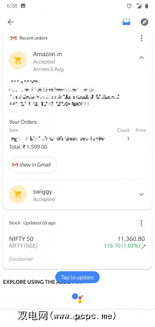 Google应用程序还将您即将到来的预订和订单合并到一个页面上。这使您可以快速浏览详细信息,例如确认号。不幸的是,如果您的主帐户不在Gmail上,则此操作将无效。您可以在Google应用的第二个标签中找到您的预订。