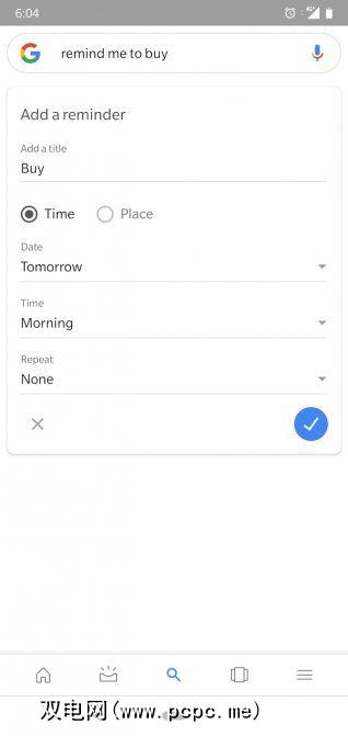 您可以通过按麦克风图标来询问Google助手,也可以直接在搜索框中输入查询,例如“提醒我明天买牛奶。"。如果愿意,请进入提醒部分,然后点击浮动的加图标进行另一种选择。