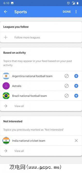 通过Google应用,您可以轻松跟踪运动队和联赛。要告诉应用程序哪些是您的最爱,请转到最后一个标签中的自定义选项,然后点击查看所有设置。在此处,体育部分下,您可以专门添加要为其获取更新和警报的球队和联赛。