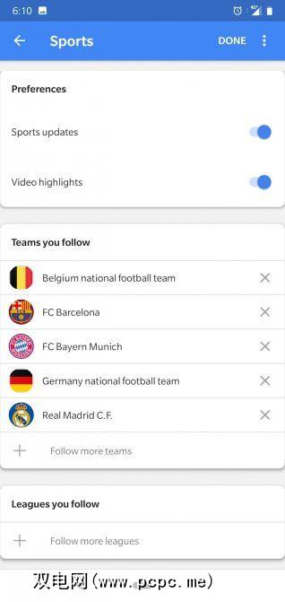 Google甚至可以通过以下方式向您发送视频精彩片段通知。此外,在页面底部,有一个名为不感兴趣的类别,您可以在其中将俱乐部和球队排除在供稿中。