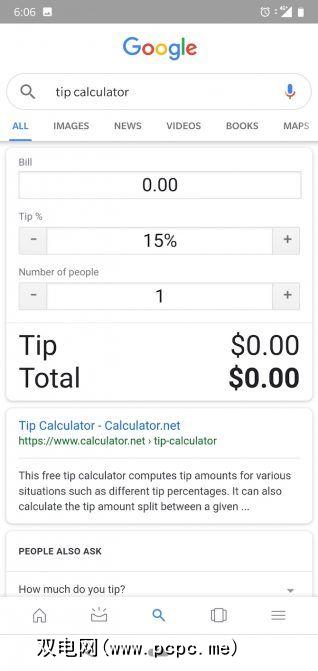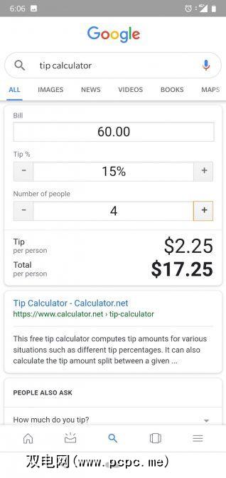 Google应用也捆绑了一个漂亮的提示计算器。为此,请在搜索栏中输入计算小费或小费计算器。然后,您可以指定账单金额,要支付多少小费,甚至还可以指定要知道每一方欠多少钱的人数。