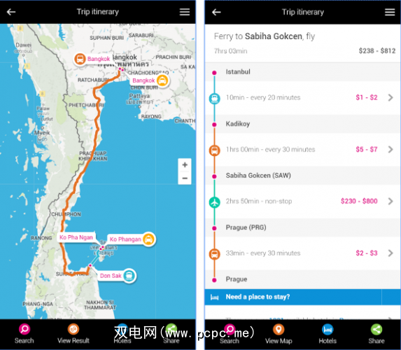 简单。下载Rome2Rio。它是全球性的运输计划人员,不包括航班,火车,公共汽车,渡轮和租车。输入目的地,您将获得所有可能路线的预计旅行时间和票价。