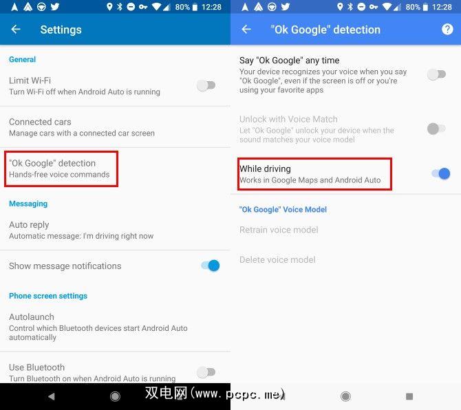 请确保通过打开Android启用此功能自动,然后滑出左侧菜单,然后选择设置。点击“确定Google"检测,并确保您已打开行驶中。只要您打开Android Auto,即使您关闭了屏幕,Google Assistant也会响应。