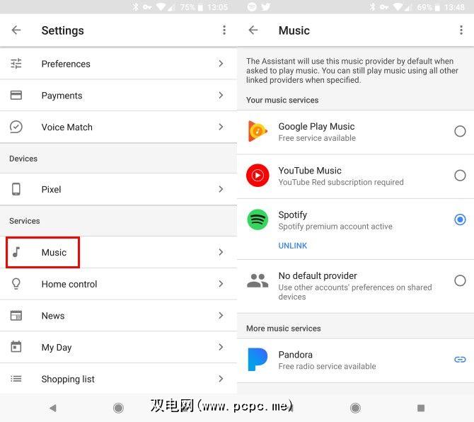 此处,点击音乐条目。您会看到已安装的音乐服务列表。点击您要设置为默认值的那个。如果看到链接图标,则需要将该服务的帐户与Google帐户关联,然后再将其设置为主要服务。