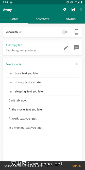 Away是另一个用于回复来自即时消息服务(如WhatsApp)的通知的应用程序。它类似于IM自动回复,但有一些其他功能可以使它脱颖而出。