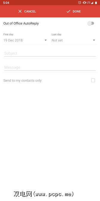向下滚动直到找到假期响应者 (这是不在办公室自动回复,在某些地区是这样)。点击该时间,然后设置持续时间,主题和消息。点击完成进行保存。您还可以根据需要选择仅向联系人中的电子邮件地址发送回复。
