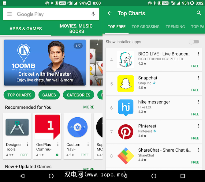 如果您尚未登录Google帐户,系统将提示您登录。商店将在应用程序的主屏幕上向您显示趋势和推荐的应用程序。点击顶部的搜索栏(显示Google Play)以开始搜索要安装的应用。或点击“热门排行榜"或“类别"按钮开始浏览热门和免费应用程序。
