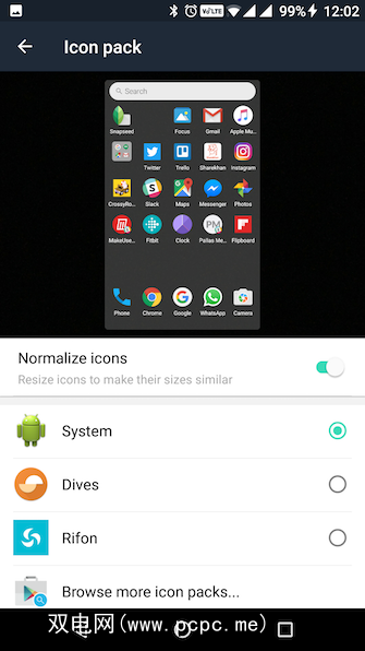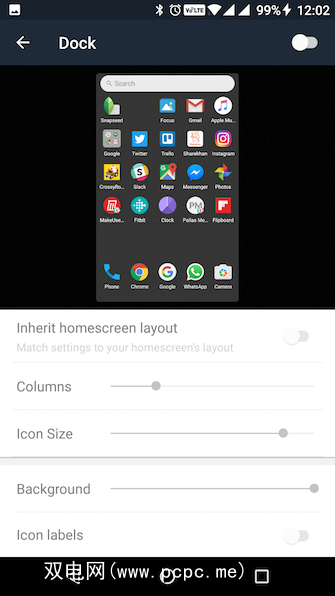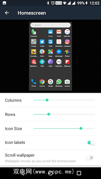 主屏幕:在这里,您可以更改列数和行数,并切换图标标签,调整图标大小并启用滚动墙纸。