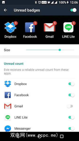 未读徽章:这是您可以启用的另一种iOS功能。授予对Evie的通知访问权限后,您可以逐个或逐个启用此功能。您还可以调整标志的大小。