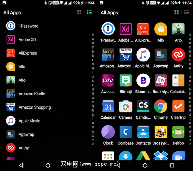 您会注意到主屏幕上没有应用程序抽屉图标。要进入应用程序抽屉,请向上滑动屏幕上的任意位置。您会看到按字母顺序排列的所有应用列表。使用右侧的洗涤器跳到特定字母。