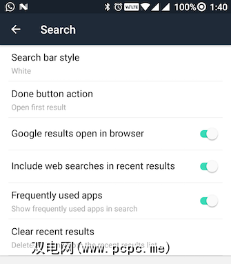 搜索:在此部分中,您可以调整搜索栏的外观和行为。您可以切换到白色样式。您还可以更改“完成"按钮的行为来打开第一个结果,而不是关闭键盘。