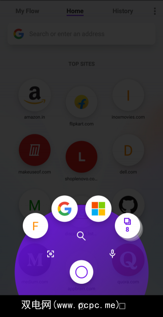 “快速操作"按钮是浏览器的心脏。长按按钮并向上滑动时,按钮的内容会扩展。它会根据您在应用程序中的位置显示不同的菜单。